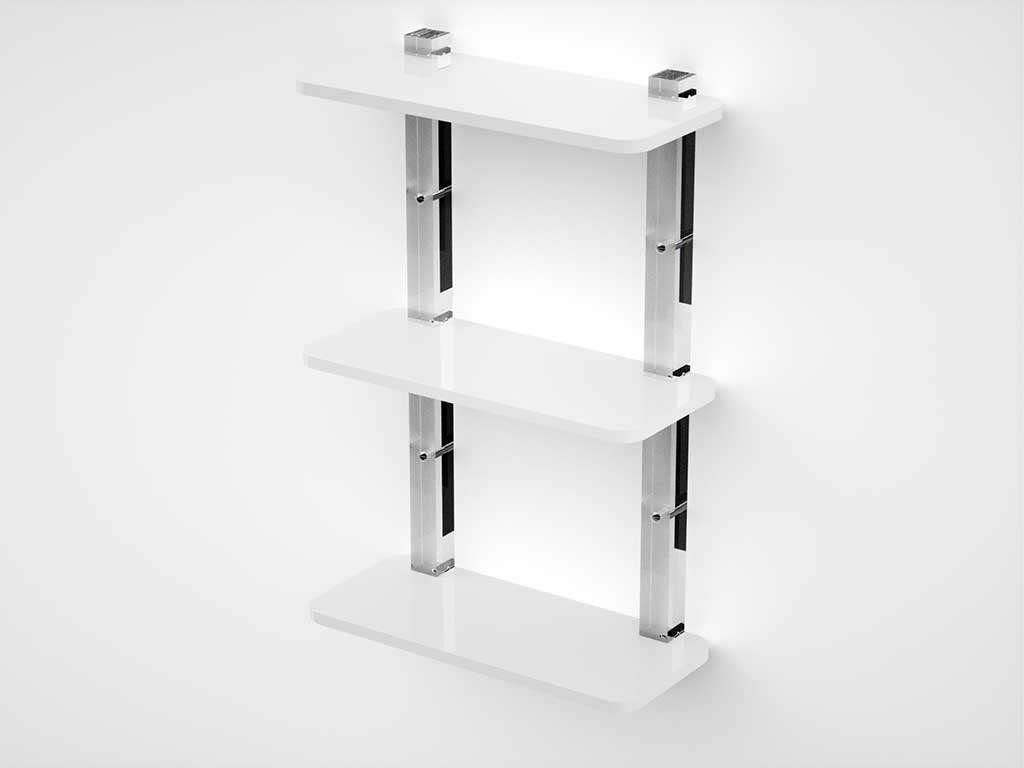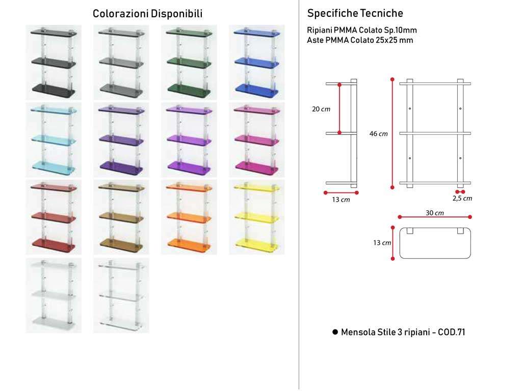 SIZES: Shelf Stile L 30 X P 13 X H 46 cm - COD.71 Height of the shelf 20 cm Dimension of the rod 2.5 X 2.5 cm Thickness 10 mm COLORS: Wide range of colors. BENEFITS: Accessory made in Plexiglas (acrylic glass), which is perfect for all tastes thanks to its endless color variations