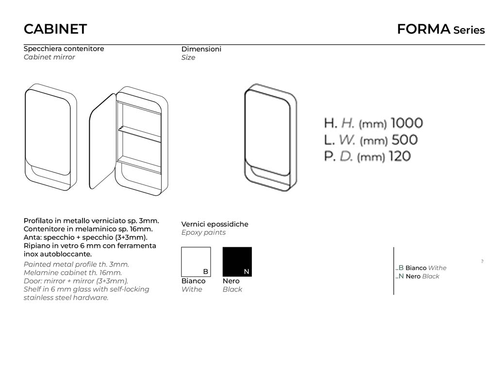 Bathroom storage mirror, rectangular mirror, modern bathroom storage mirror, bathroom storage mirror 50 cm, ideal as a bathroom mirror. The metal outer frame of this container mirror gives it both solidity and elegance, with a generous compartment. The mirror door has two sides, outer and inner. Dimensions: 50x100x12 cm Frame: painted metal profile Cabibet: MFC 16 mm Cabinet door: mirror + mirror (3+3 mm) Shelf: 6 mm glass with self-locking stainless steel hardware Colour: Liquid paints, Epoxy coatings Product made in Italy