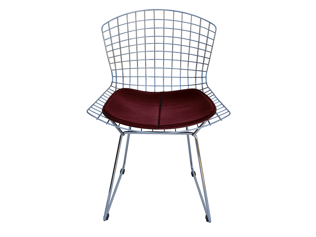 Structure of the chair with welded rods in chromed metal and padded cushion in printed calfskin for the seat.