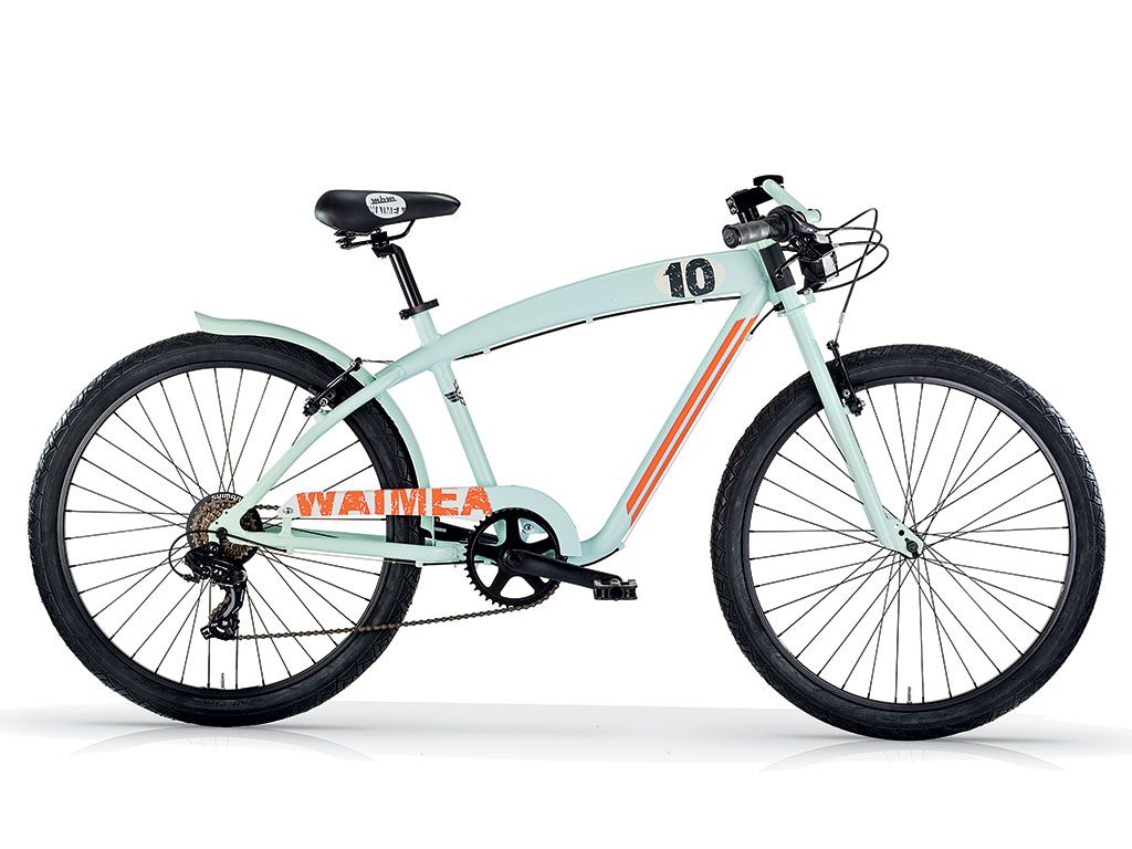 Waimea Bikes were invented by German industrialist Schwinn, who thought a bike with a unicque design, wich became famous in California beaches mostly aroound the 70s with the name "Beach Cruiser".Its most important features are the sturdy tires with a wider diameter than classic bikes, the structural strength , a confortable saddle and a large handlebars, all these features characterize the bike to a very unique retrò motobike style.Very popular on the Italian seaside and on the Riviera bike tracks.