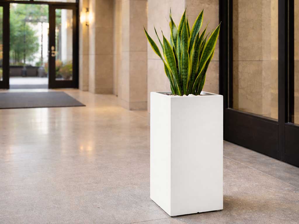 Plastic high cube cache pot planter, refined polyethylene vase. Elegant and coloured decorative vase, suitable for any context. Perfect for homes, public places, restaurants, hotels, bars. Resistant to atmospheric agents and UV rays.