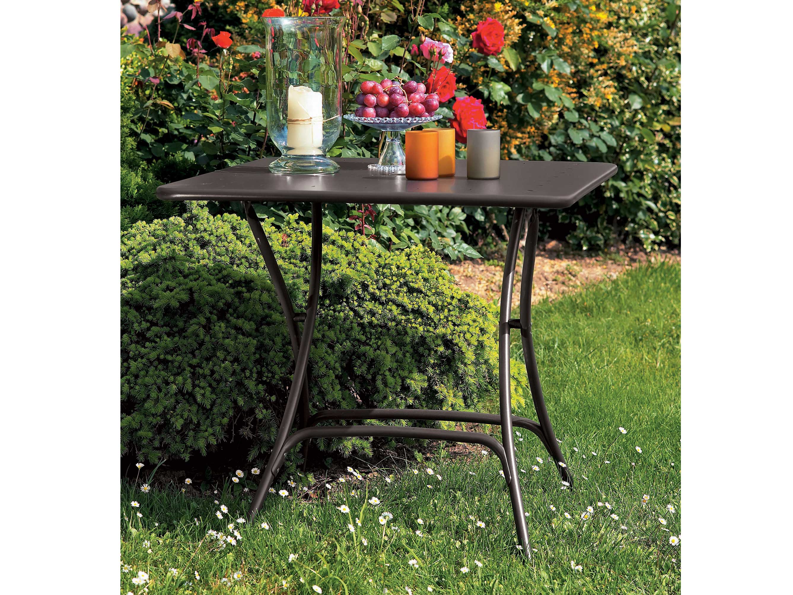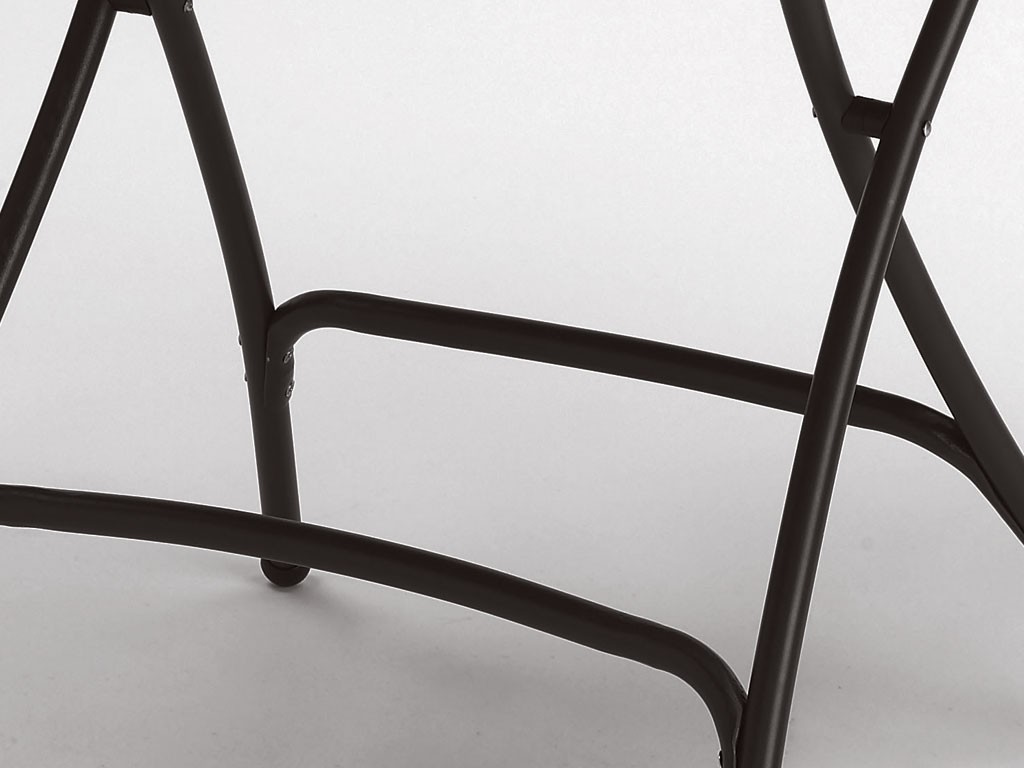 Top: sheet metal with decorative pattern.Legs: tubular in steel.Folding.