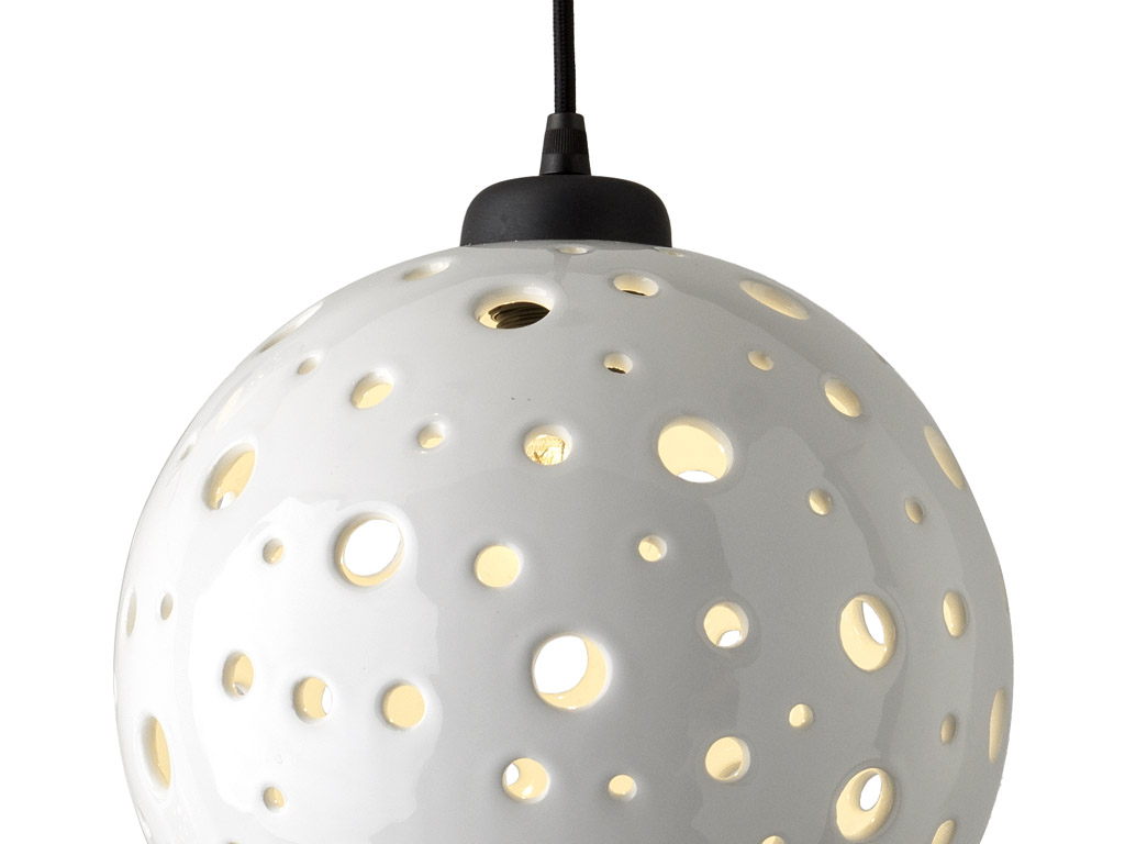 The spherical white ceramic lampshade is perforated with holes of different sizes.