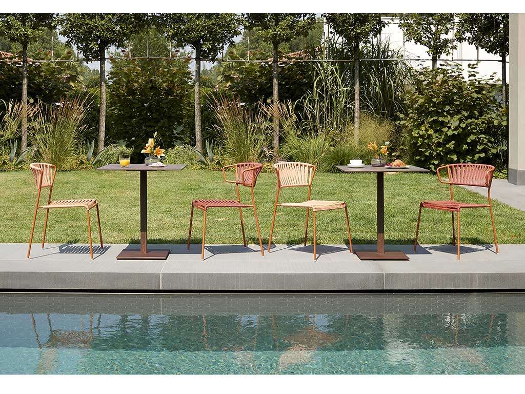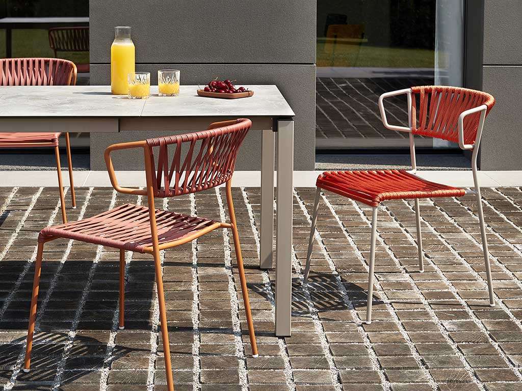 Garden chair, chair with armrests, outdoor chair, metal outdoor chair, perfect as balcony chair or metal garden chair.Metal garden chair with armrests with seat and backrest in woven PVC to make it comfortable, easy to move and stackable. Furnishing accessory with an informal but accurate style, perfect to decorate outdoor spaces.Particularly suited and recommended for tourist accommodations such as hotels, rural tourism or B&B that have swimming pool, garden and/or outdoor space.