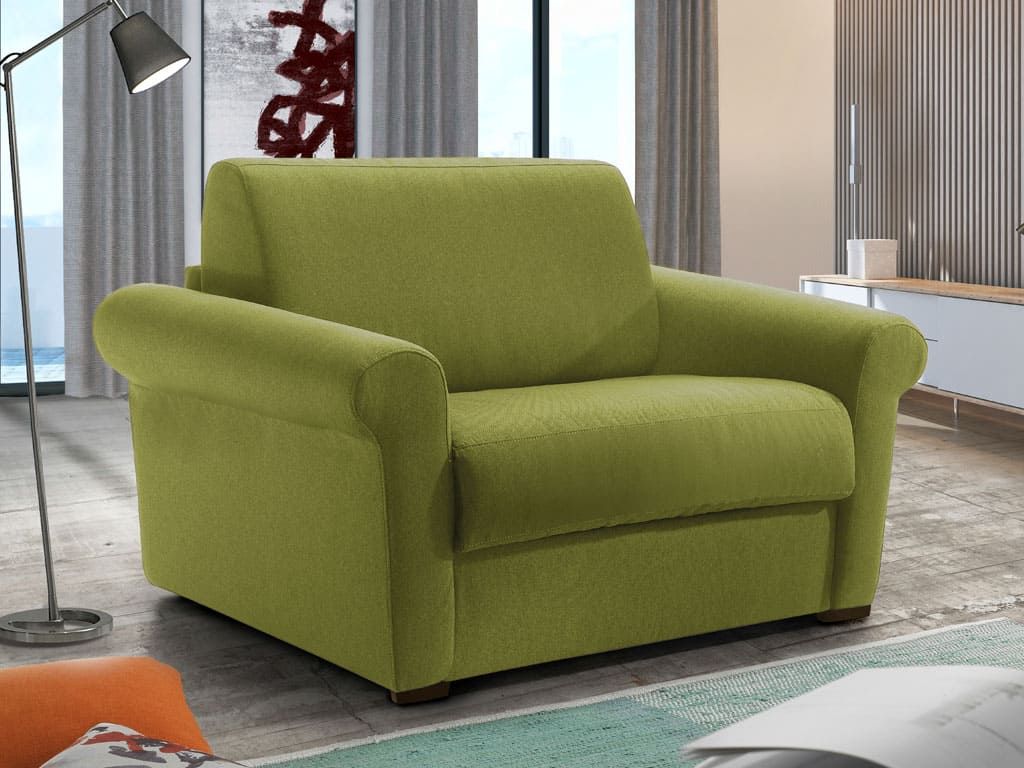 Fabric armachair-bed with armrests and a classic design, it turns into a bed in a simple move.