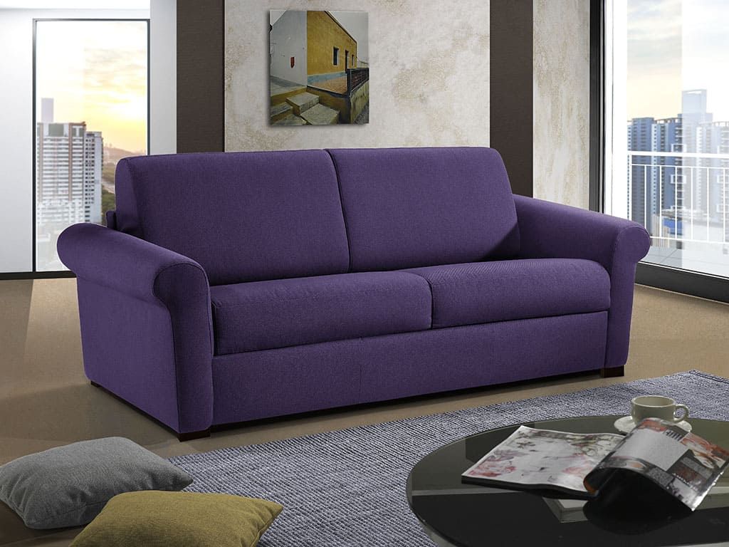 Sofa-bed with armrest, classical and roundish lines, it turns into a bed in few simple moves thanks to the practical lace hidden between the backrest’s pillows.