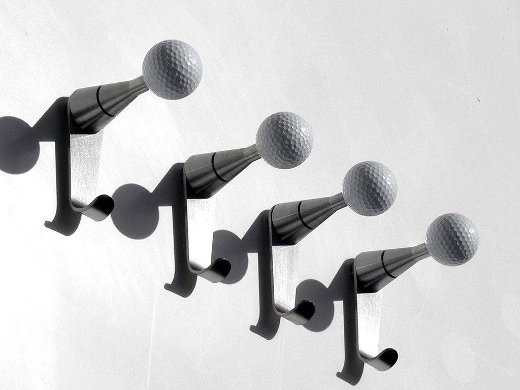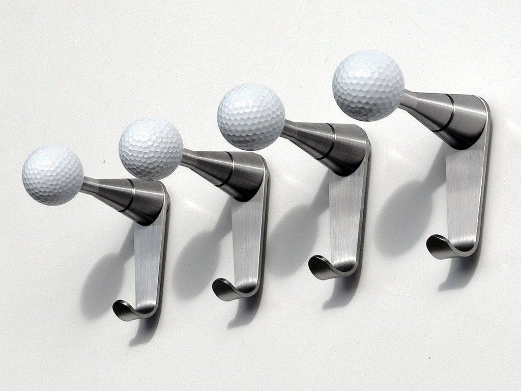 Wall coat rack, fancy coat hooks, design coat rack, perfect as bedroom door hooks or modern coat rack.Golf + is a wall coat and clothes hook that has a golf ball as knob with a stainless steel extra lower hook. The product is modern and original, so it is appropriate for young and very young people.The conic body, turned in stainless steel, allow the installation on every kind of wall. It is also possible to choose among two different kinds of supports: aluminium and stainless steel.