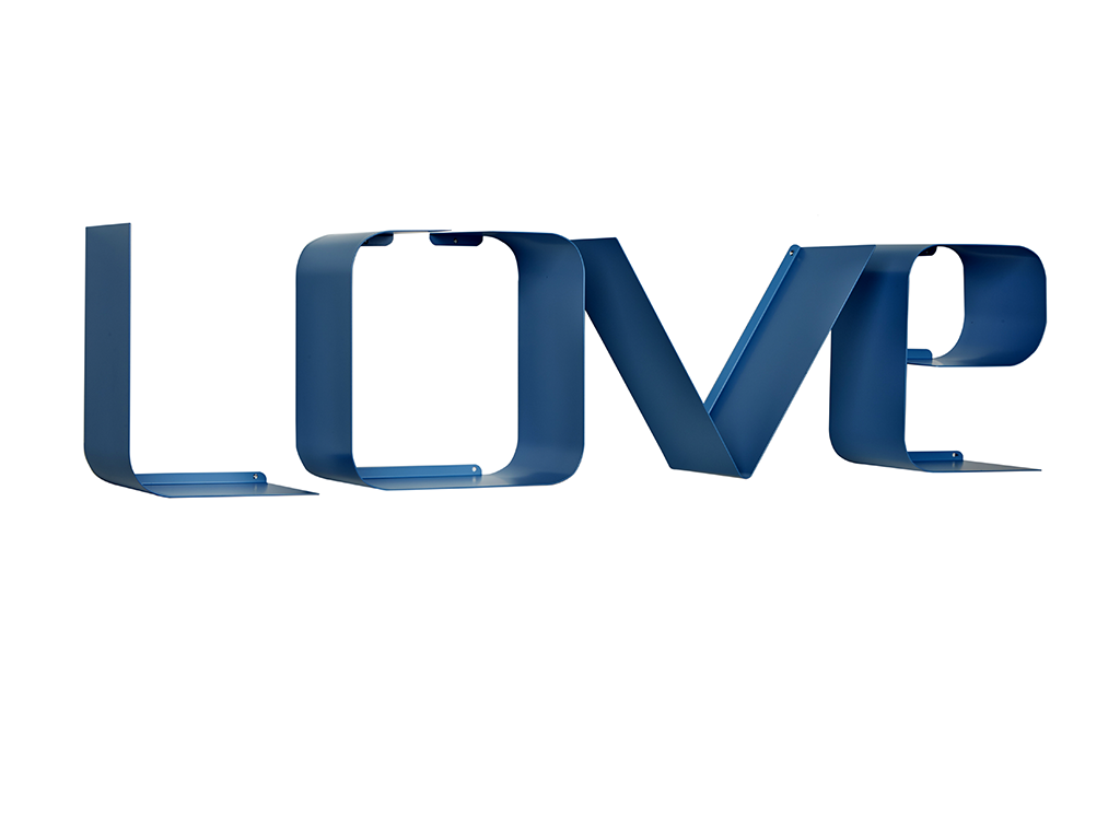 Shelf available in various colors, composed of 4 letters made of varnished metal composing the word LOVE.