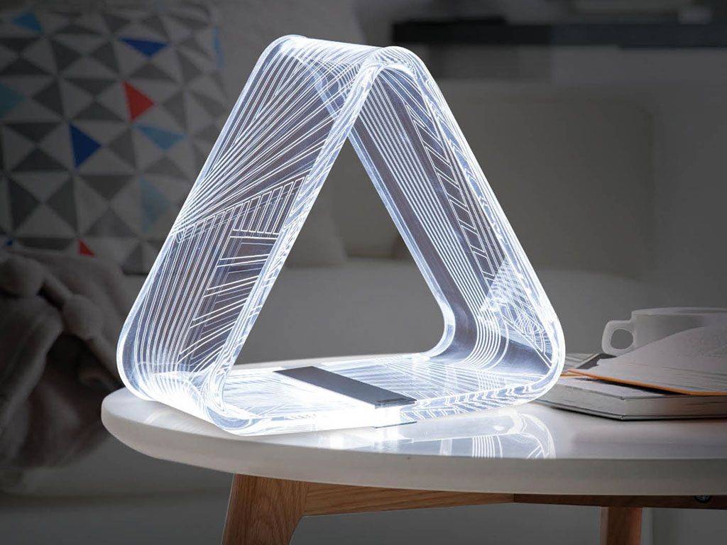 Triangle-shaped Table LED lamp in acrylic crystal (Plexiglass) with pisms or vectors insert.Excellent as gift, ideal as a small table lamp or bedside lamp.