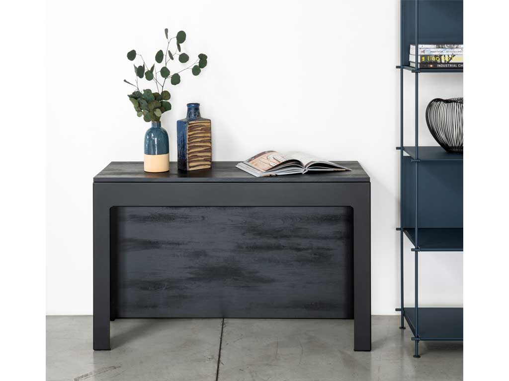 Extendable table console, built-in extension, extendable console sp. 120 cm, ideal als elegant console table. Extendible Table-Consolle with painted steel foil structure. Top in ecofriendly laminate 18 mm. The table is supplied complete with 4 extensions (cm 60 each) that find housing inside the structureand become the bottom of the closed console integrating perfectly into the same.