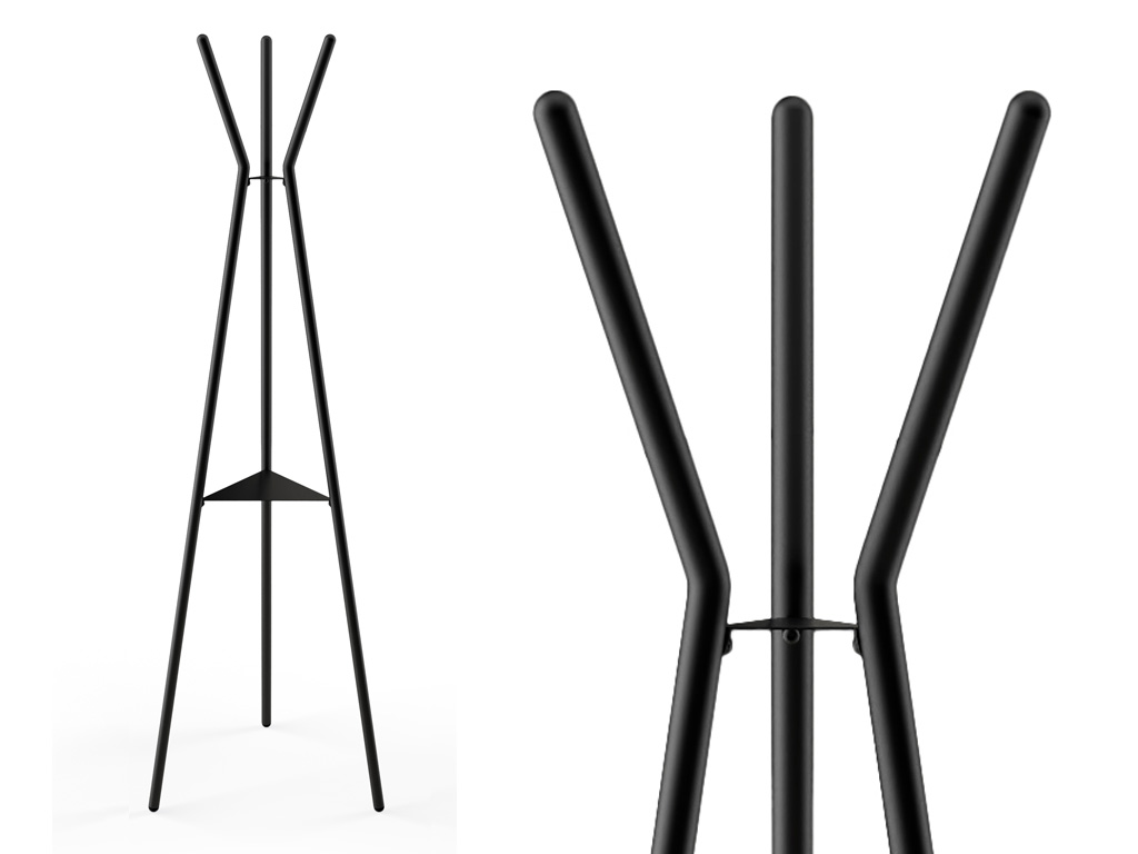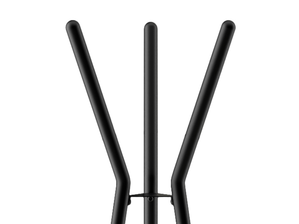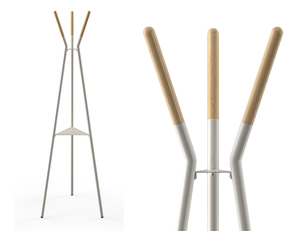 Crafted with a solid powder-coated metal frame, the Tipi coat rack is available in two refined finishes: White and Black. For those who prefer a warmer, more natural detail, a version with upper beech wood finials is also available, enhancing the slender silhouette and creating an elegant material contrast.