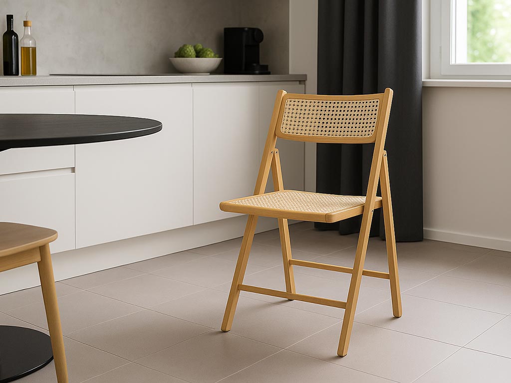 Folding wooden chair ,with solid beech wood structure, Vienna straw seat and back. Ideal as elegant and space saving chair.