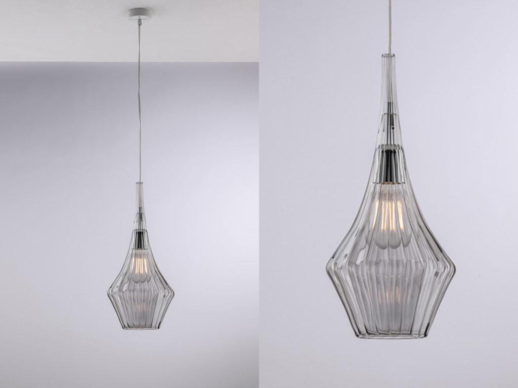 Crafted from blown glass, the lamp stands out for its harmonious silhouette and sophisticated vertical detailing, which enhances the interplay of light and shadow. The sculptural-shaped diffuser brings movement and lightness to the space, blending perfectly with both modern interiors and more classic settings.