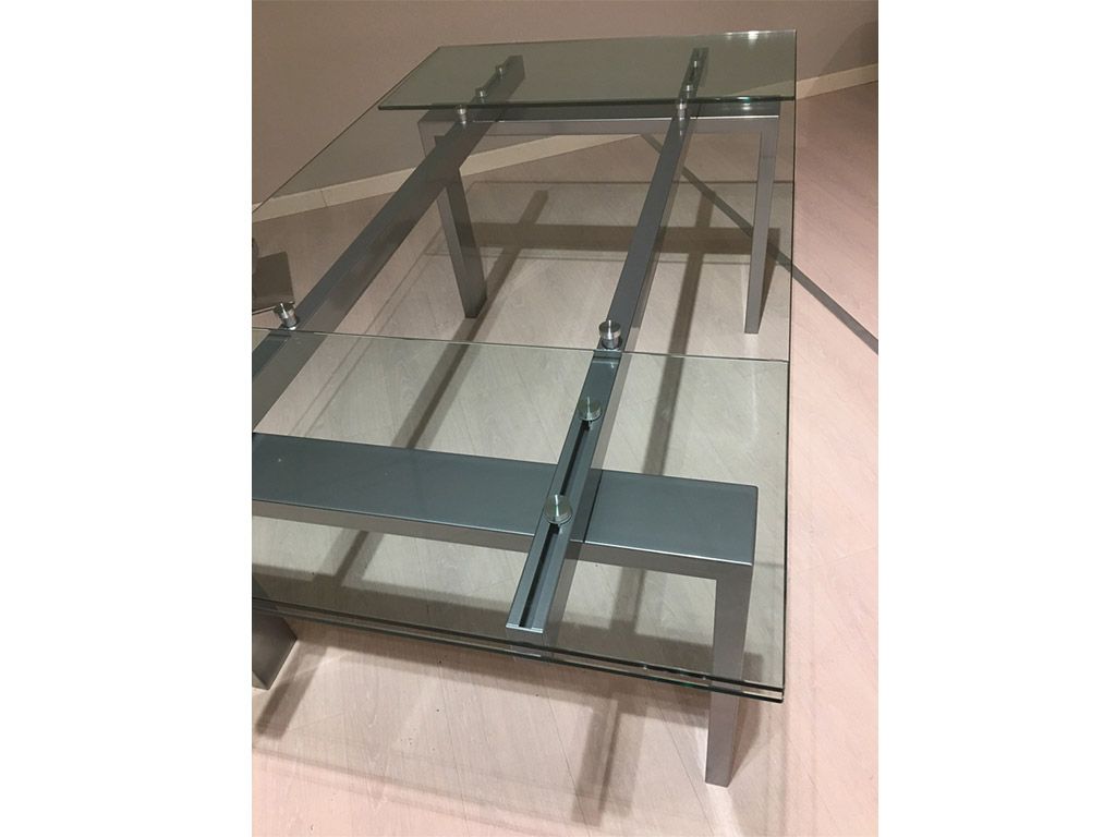 Extending table with frame, runners and legs in steel vanish glazed effect. Top and leaves available in transparent glass (12 mm thick).