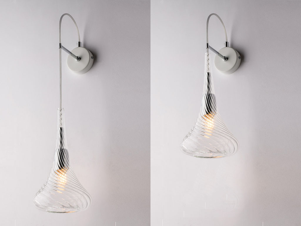 This wall lamp embodies the perfect balance between tradition and innovation. The helical lines of the glass diffuser create a mesmerizing interplay of light and reflections, giving depth and character to the surrounding space. Each lamp is the result of meticulous craftsmanship, where the ancient art of blown glass meets modern design sensibilities. The metal structure ensures strength and stability, while its clean lines and chrome finish add a sophisticated, contemporary touch.