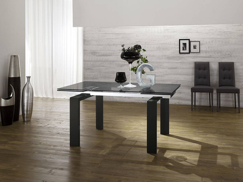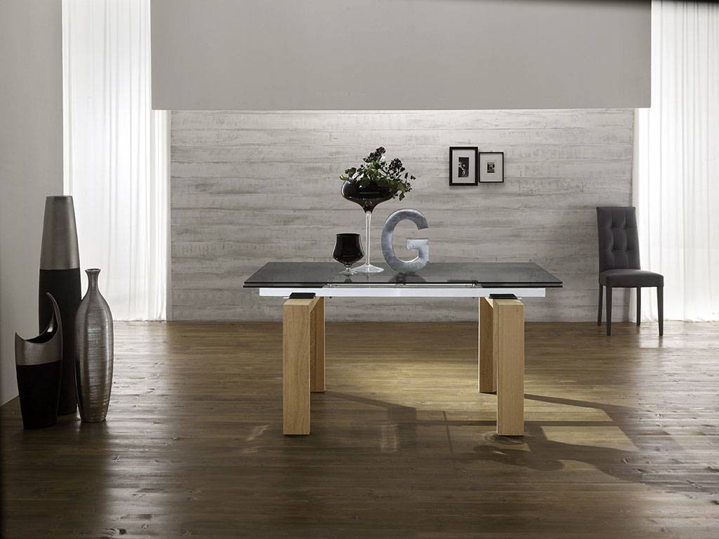 Extending table with frame in chrome-plated metal, runners in aluminium and legs in lacquered wood, top and leaves in transparent or smoky grey glass (12 mm thick).