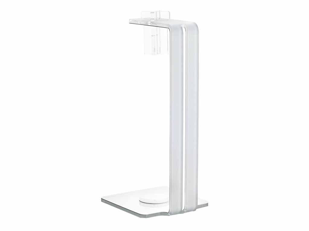 The square base has non-slip grommets, while the side rod and top pin hold the roll in place and make it easier to tear off.