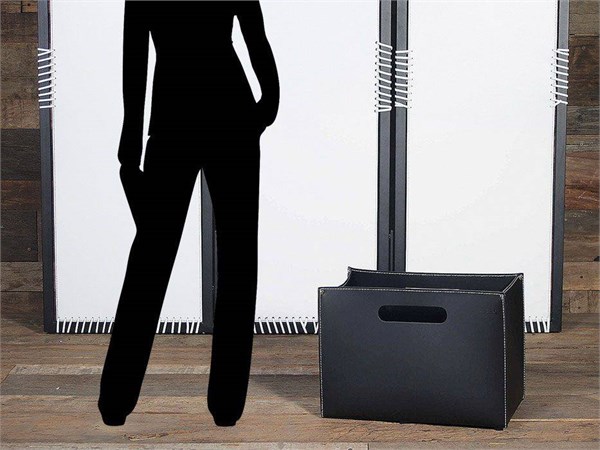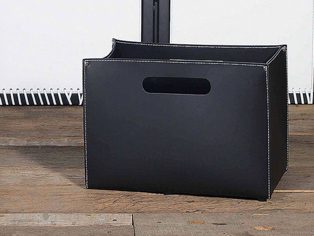 Regenerated leather magazine holder bag, with free standing wooden base with