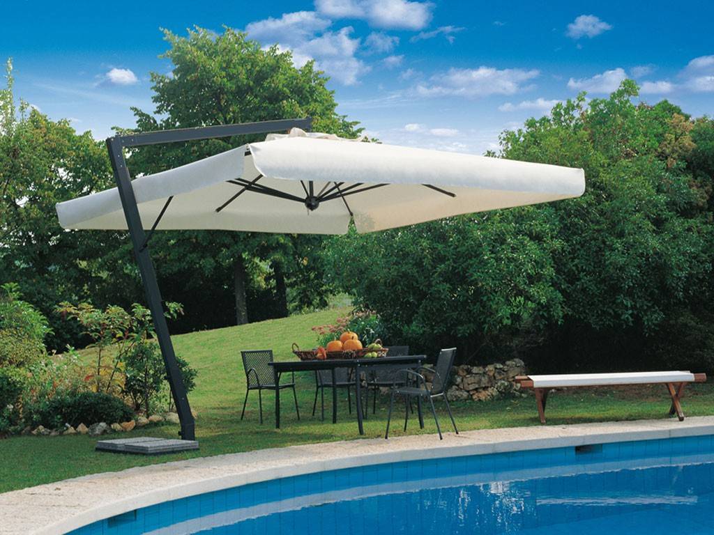 Umbrella with lateral arm, solid structure in aluminium and steel components; charcoal grey dusts varnished. Nylon accessories. Steel basis included, counterweight not included.