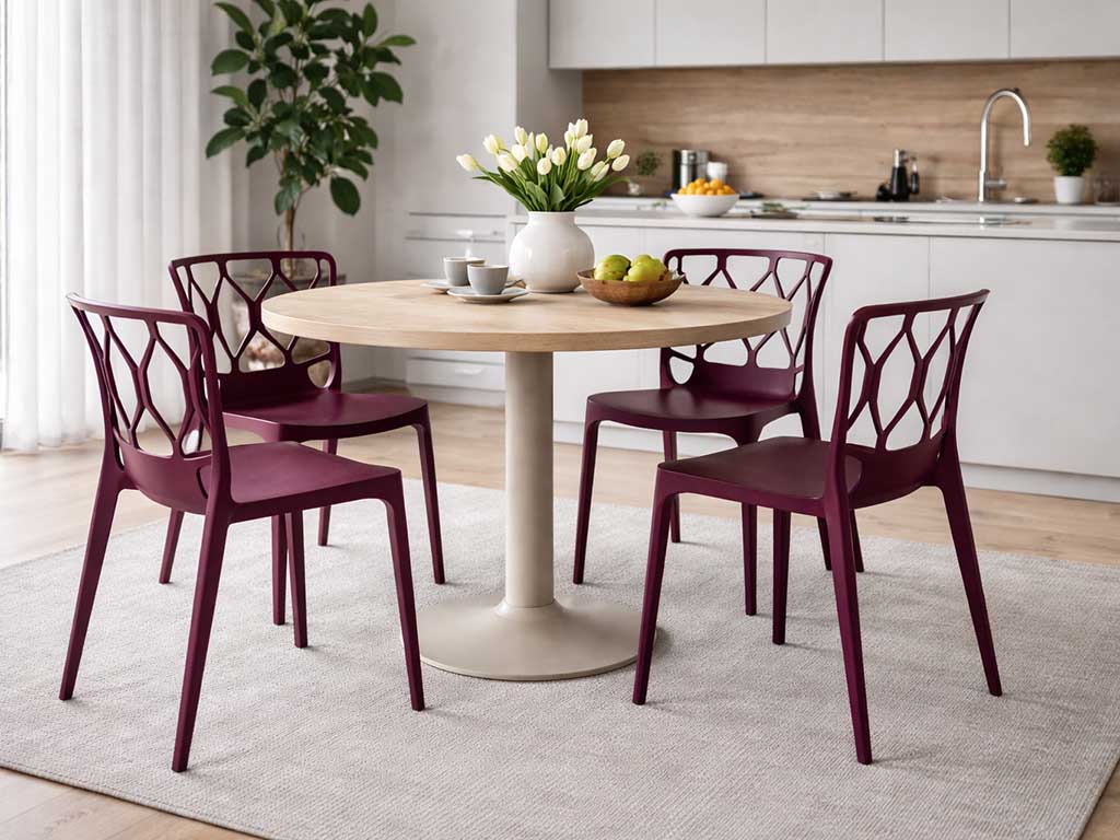 Modern kitchen chairs and outdoor chairs are now a key element of contemporary furnishing, able to combine functionality and aesthetics in a harmonious way. In this collection, the true highlight is the backrest with its distinctive design, featuring an elegant geometric woven pattern that adds visual lightness and strong decorative appeal. This carefully designed detail not only enhances the style but also provides comfort and ergonomic support.