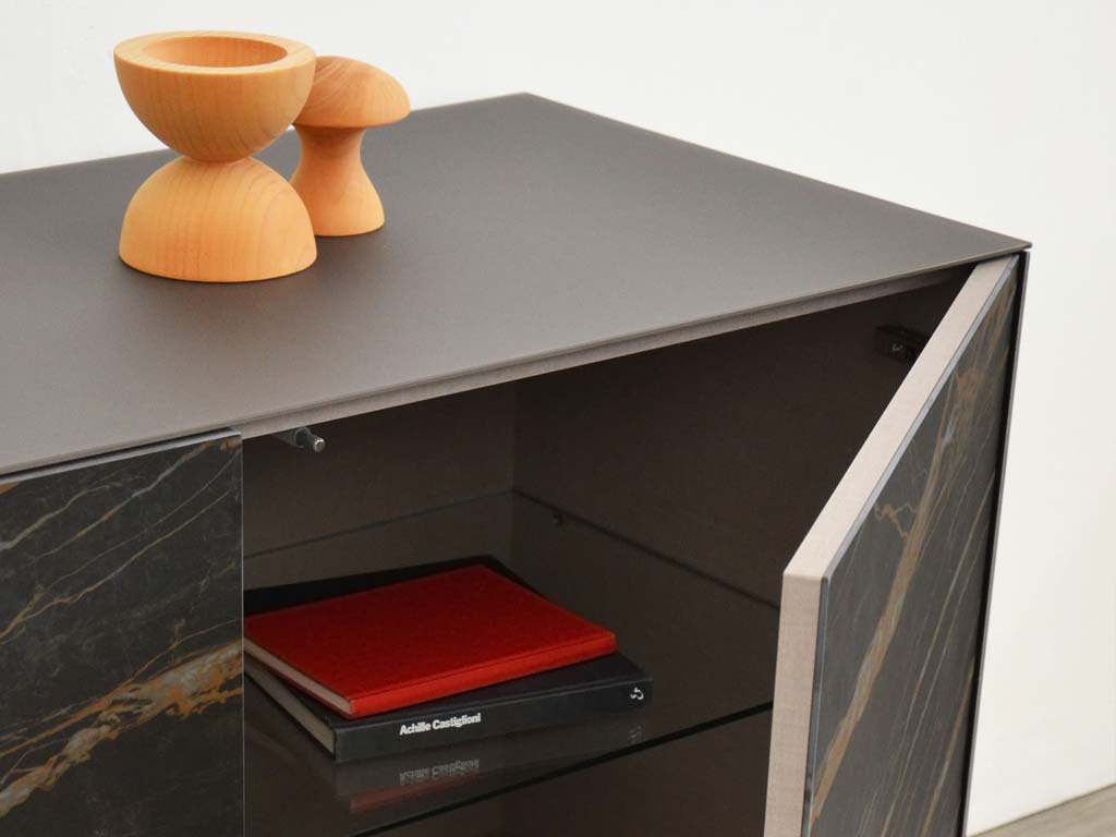 Modern sideboard, modern cupboard, black sideboard, perfect as kitchen cabinet, living room sideboard or design cupboard. Two door cupboard with top, sides and doors made of painted glass coupled with matt Noir Desir Marble-effect Ceramics and painted metal legs. Inner shelf made of glass. Sideboard covered in RAL 8019 Graubraun painted frosted glass, with doors coupled with glass, covered in matt Noir Desir ceramic. Internal wood frame covered in fabric finish. RAL 8019 Graubraun painted metal base. The doors are disassembled and must be mounted with an attachment system called pressure hinges (easy to apply with a click). Each piece of furniture is unique the grain and texture on the ceramic shown in the photo is purely indicative. Dimensions: L 120,4 X D 50 X H80 cm - 97 Kg Total weight - 76 Kg structure - 21 Kg doors Glass: painted glass coupled with Marble-effect Ceramics. The shipment is insured, the product is shipped on wooden pallets or custom-made wooden cages. These products are artisanally realised, they are glued thanks to the technique of the UV glued glass. The transparent glue is placed between two surfaces with a 45-degree cut and it is welded to the glass by using specific ultraviolet lamps. The technique of the UV glued glass arises from aeronautical technology, the gluing process of glass proves to be extremely strong and resistant, even though it is completely invisible on the glass surfaces. The glued glass is perfect to realise different pieces of furniture made of glass, such as coffee tables, tables, console, mirrors, etc. Made in Italy product