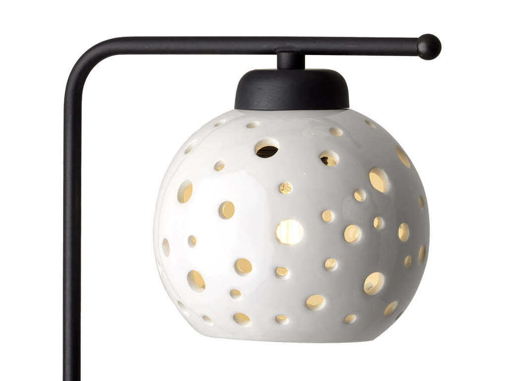 The spherical perforated white ceramic lampshade creates beautiful light and shadow effects.