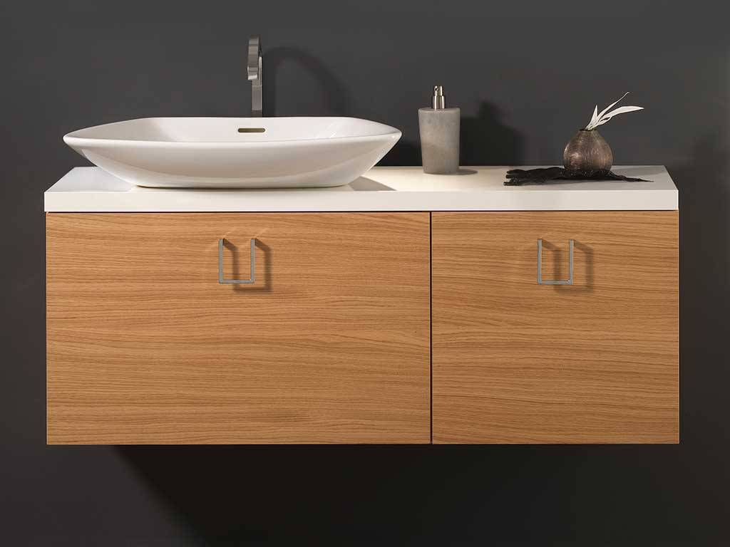1 Hanging sink-holder base with veenered basket 1 Hanging base 1 veenered door 1 White shiny lacquered top 1 Veenered wall cabinet 50 cm 1 Mirror 78x47,5 2 Chromed lamps 220V 1 Trapezium sink in ceramic cm 68x47
