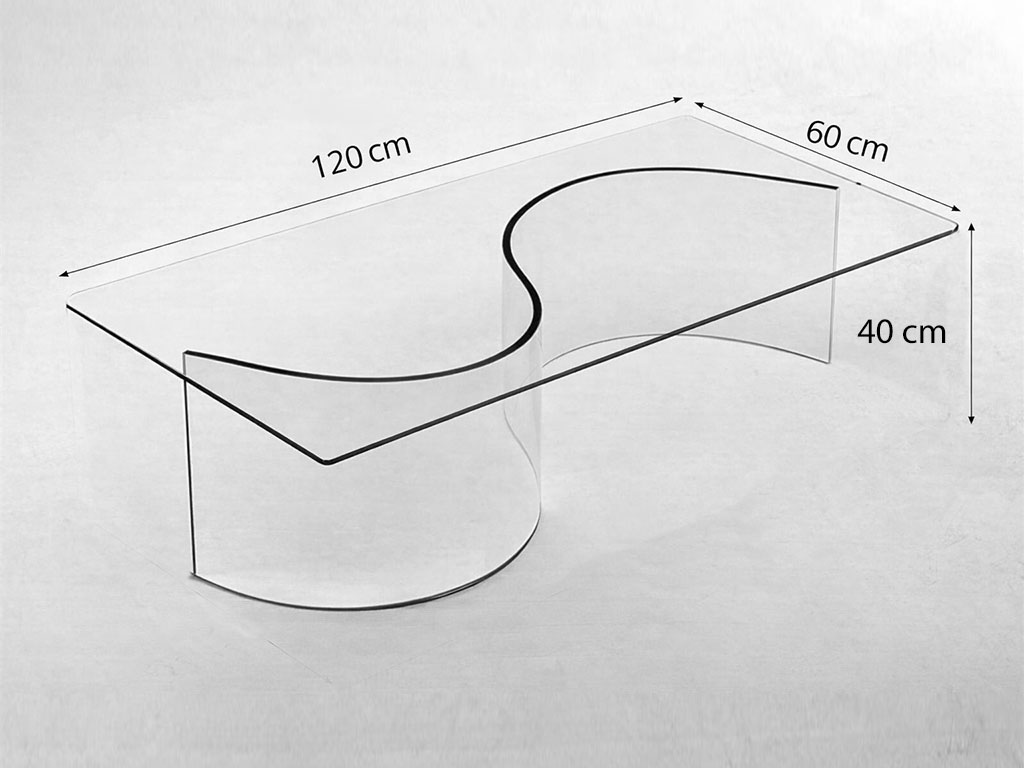 Coffee table with rectangular transparent top ans S shaped base in transparent curved crystal.