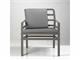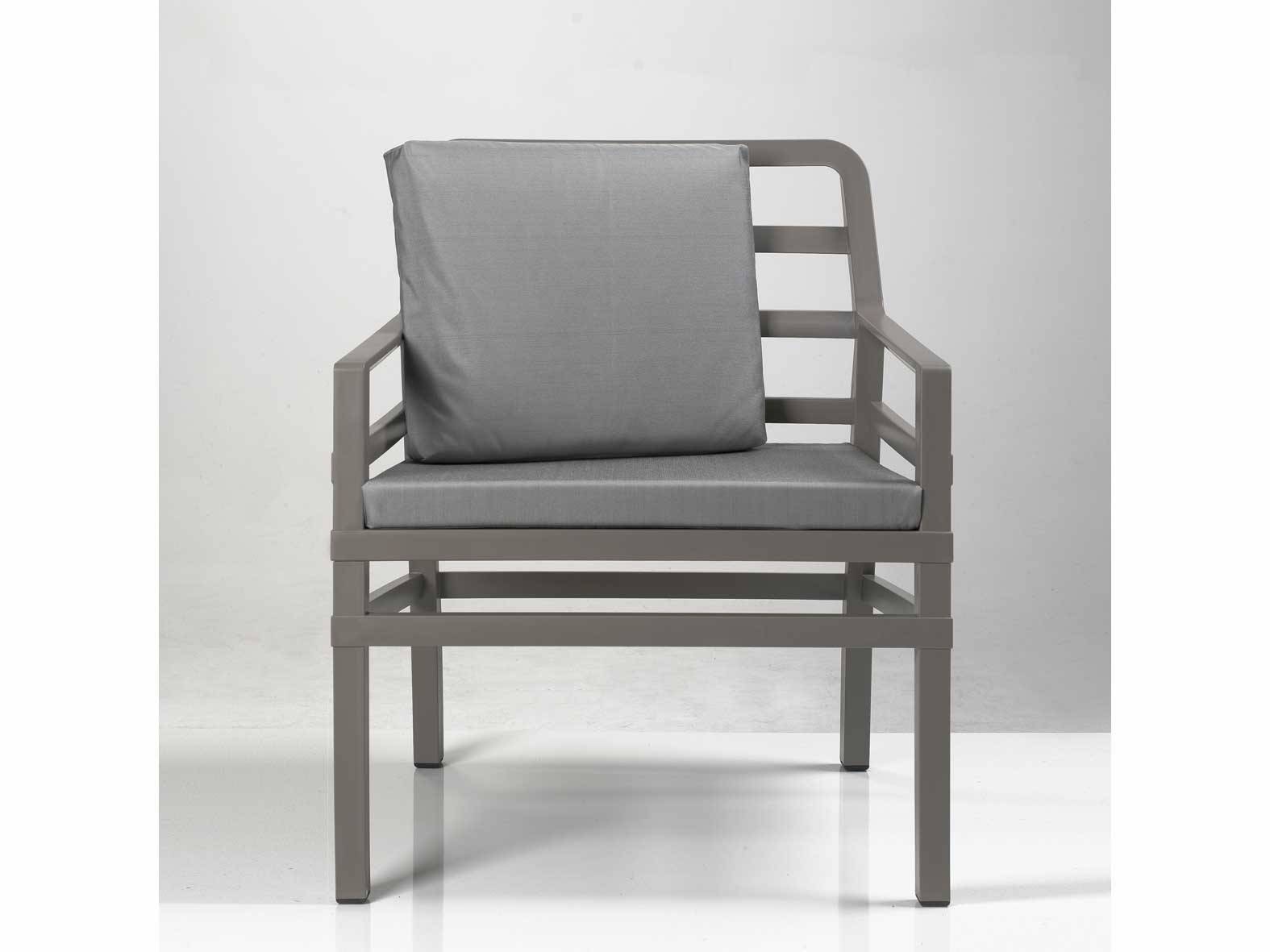 Outdoor and Indoor relax polypropylene armchair, demountable, with cushion and small non-slip foots. ARIA has a staved structure a little bit enveloping , his design takes up the theme of the romantic wood fences. The geometric design of the staves, the variation of their grade and distance, the relief effects of the different junctions give to the seat a light and a slender line. The Aria collection includes also a little table, with different measures, perfectly corresponding with the stylistic lines of the seat.