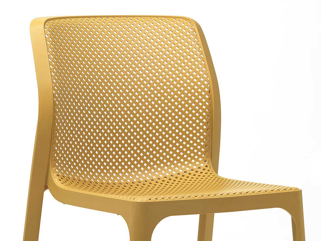 The design, the perforated pattern and the variety of colors make this chair suitable for different outdoor and indoor environments.