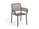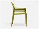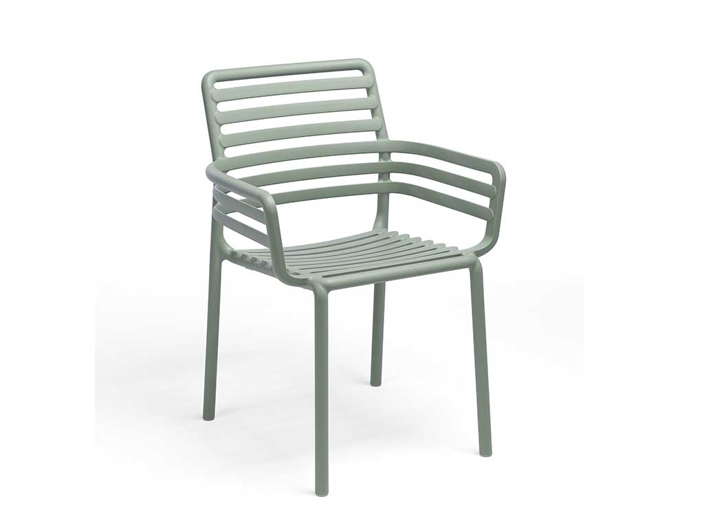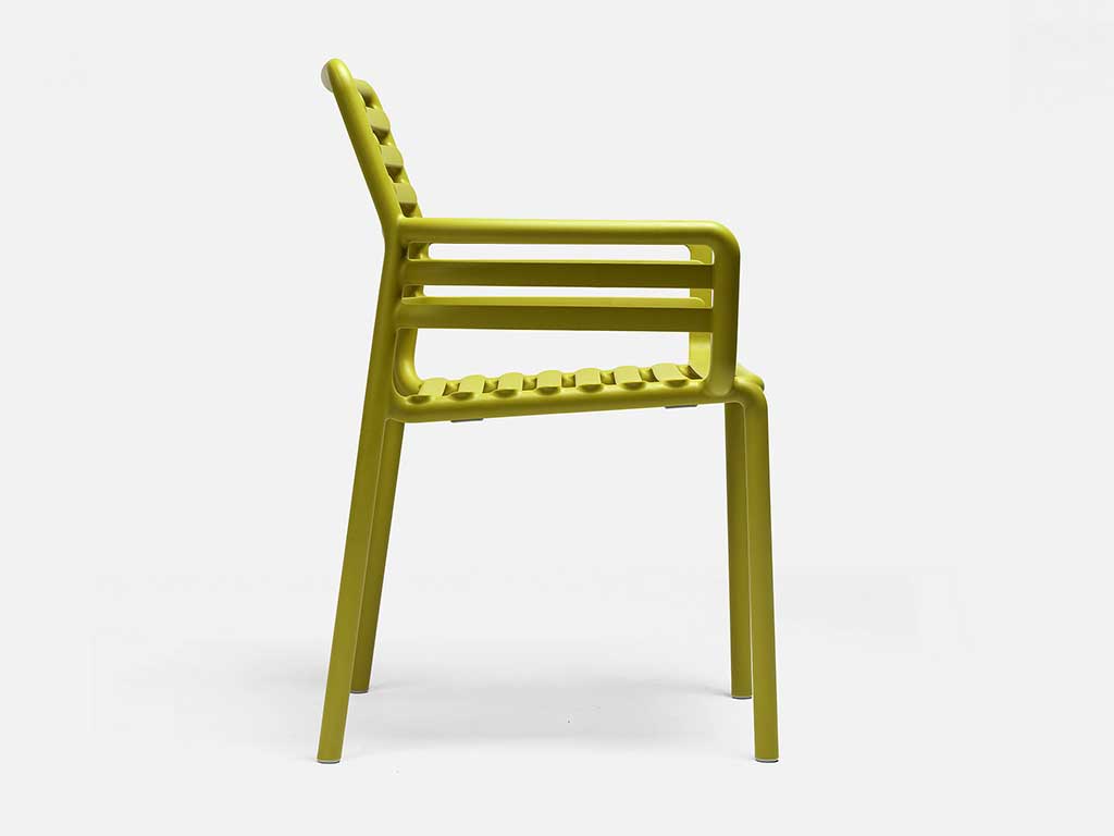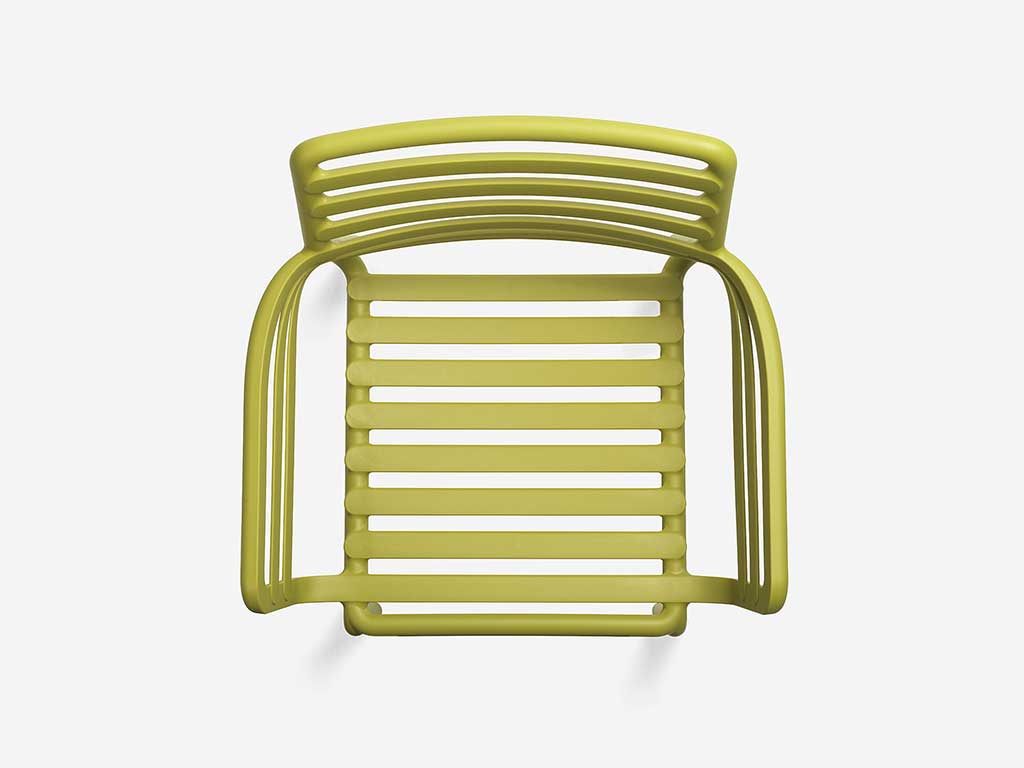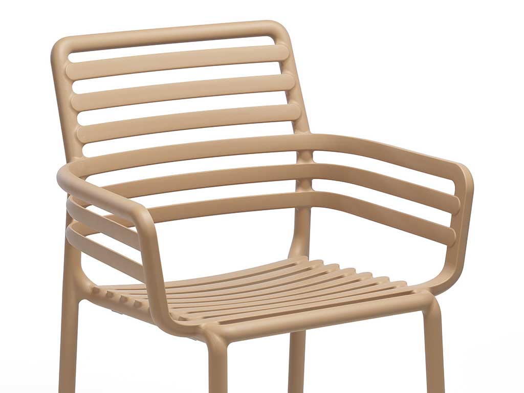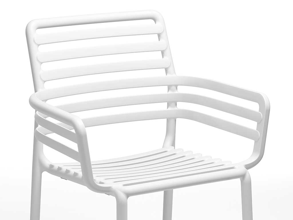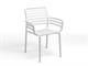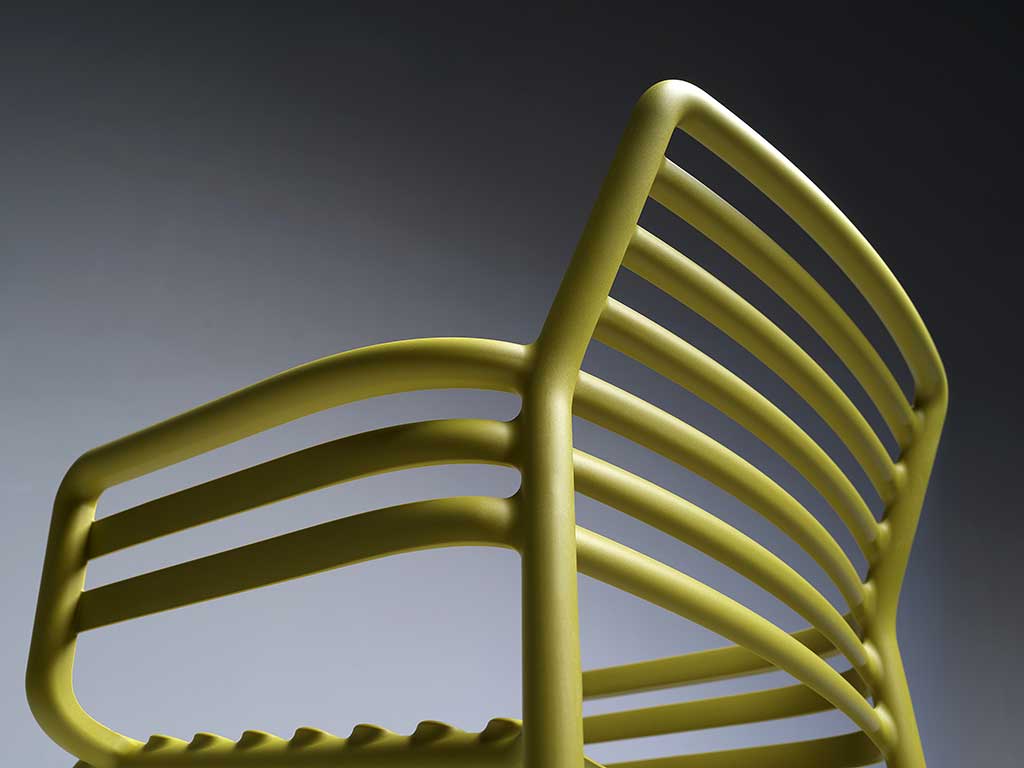 Chair with armrests for outdoor spaces in fiberglass resin. It is easy to handle, stackable, easy to sanitize and completely recyclable.