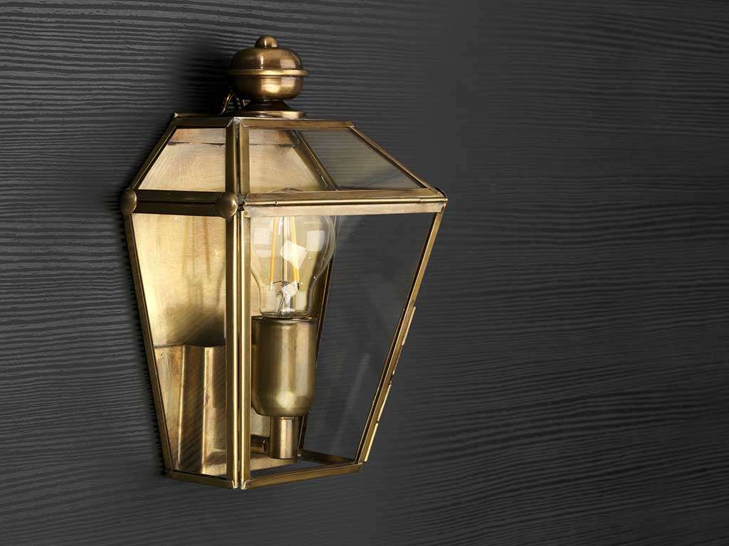 Outdoor wall lantern, ideal as wall lantern for outdoor spaces, with transparent glass and Bronze or Brass frame. Suitable both as indoor lamp and covered outdoor lamp. The lamps are attached to the wall through a special slot on the back of the lamp. Ideal for historic residences, old country cottages and places full of charm and refined design. DIMENSIONS: