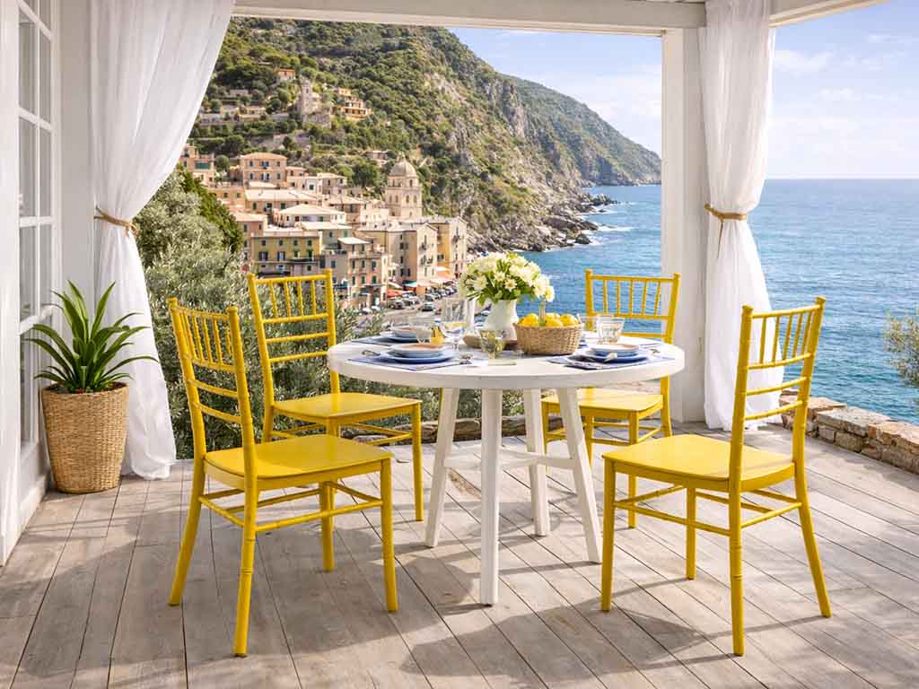 Polypropylene chairs are now one of the most sought-after solutions in both the contract and residential furniture sectors. This elegant Chiavari chair reinterprets the iconic design of the Ligurian tradition in a contemporary way, combining refined aesthetics, lightness, and durability in a single versatile and functional product.