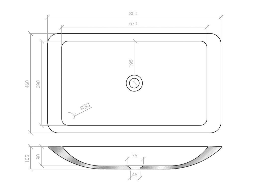 Rectangular countertop washbasin made of acrylic stone (an equivalent material of Corian, with a consistency similar to the natural stone).