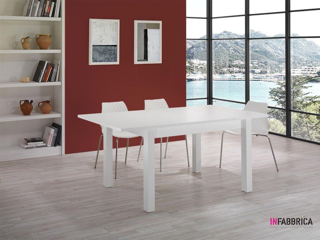 The table extends by making the tabletop flowing and extracting the extension from an opening placed under the tabletop, the legs are made of massive ash wood painted in the same color of the tabletop.