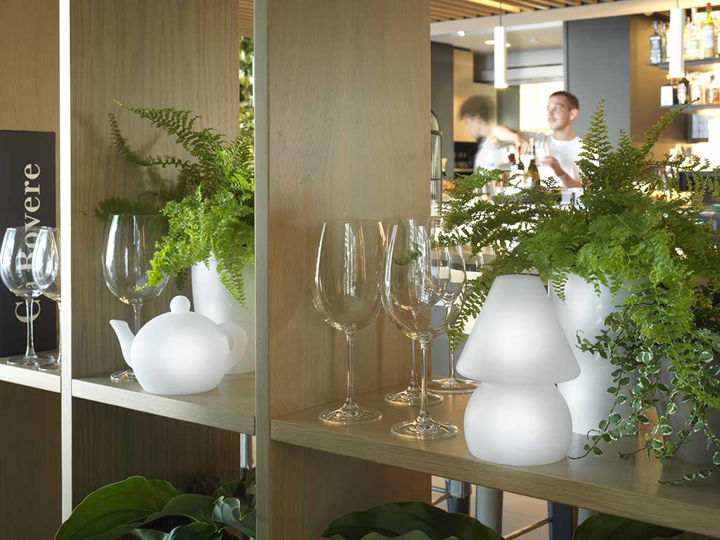 Restaurant table lamps, cordless table lamps for restaurants, battery restaurant table lamps, suitable as rechargeable restaurant table lamp, realised in polyethylene.