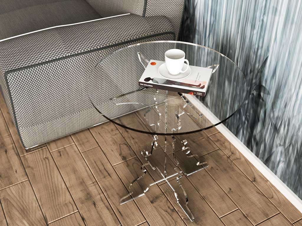 Round small coffee table in acryl glass for the living room, it is charachterised by an elegant central basement. Suitable in the living room as coffee table next to the sofa or as bedside table in the bedroom.