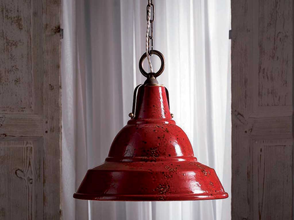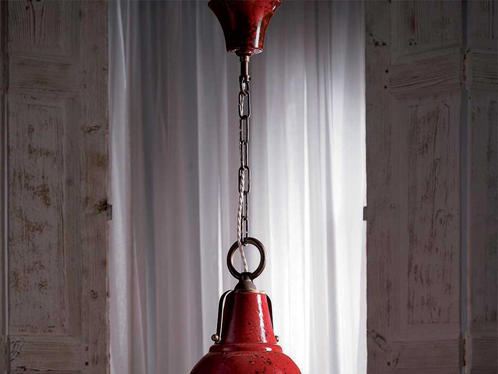 Rustic hanging light, pendant lamp with structure and chain made of aged brass, and lampshade and wall lamp plate made of painted ceramic in different colors available. The bell-shaped lampshade made of ceramic, directs the light exclusively downwards, and makes the lamp suitable for lighting living environments and especially dining tables and kitchen island.