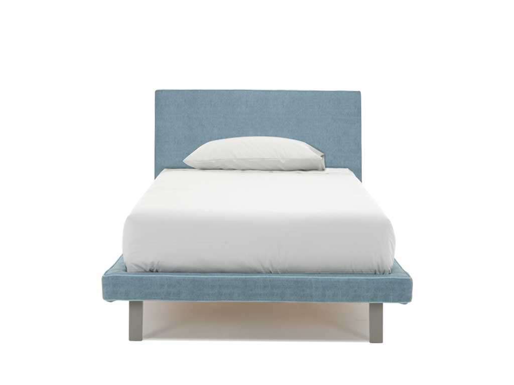 Single bed design, modern design bed with minimal Japanese style. The bed is covered with denim effect fabric, with wooden foot in aluminum color and bed frame with blue border. Available only in the version without container. Dimensions: Single bed cm L 240 D 111 headboard H 89 cm - Bed base cm 90 X D 200 cm Bed frame H 9 cm Foot height 21 cm Removable bed frame - Removable headboard - Bed base included Also available in 120 cm bed or double bed versions.