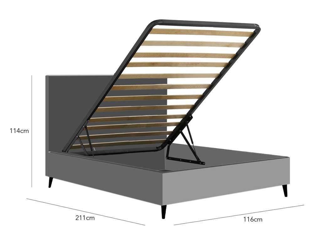 Single modern bed, elegant upholstered bed with a simple but at the same time refined design. Upholstery in fabric, with wooden foot in aluminium colour. Available in 2 versions, bed without container or storage bed. Dimensions: Single bed cm L 206 D 116 headboard H 114 cm - Bed base cm 90 X D 190 cm Foot height 13 cm Removable bed frame - Removable headboard - bed base included Also available in 120 cm bed or double bed versions.