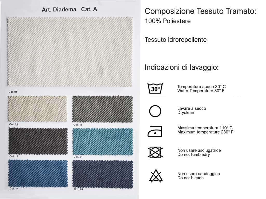 When cleaning the coatings, follow the washing instructions related to the different type of fabric (see photo). Do not use products that contain abrasives, alcohol, ammonia, or other solvents.