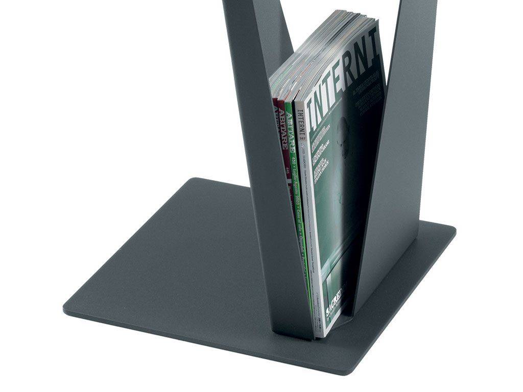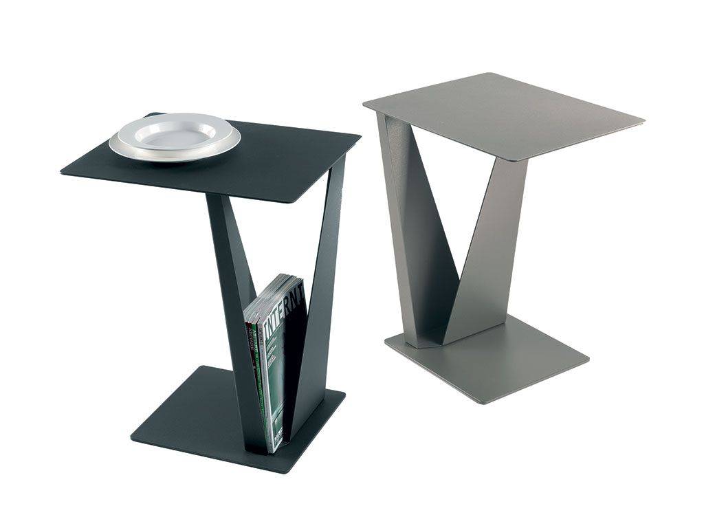 SIZE: cm 40x50x60h STYLE: Innovative and practical table, thanks to its multifunctionality given by the base which integrates a magazine rack. COLORS: White, Ardesia Grey, Dovegray, Black, Blue, Copper and Gold. BENEFITS: Practical table for eating and using a laptop, sitting comfortably on the couch. The thin and durable aluminium-shelf is combined with a steel structure which provides stability