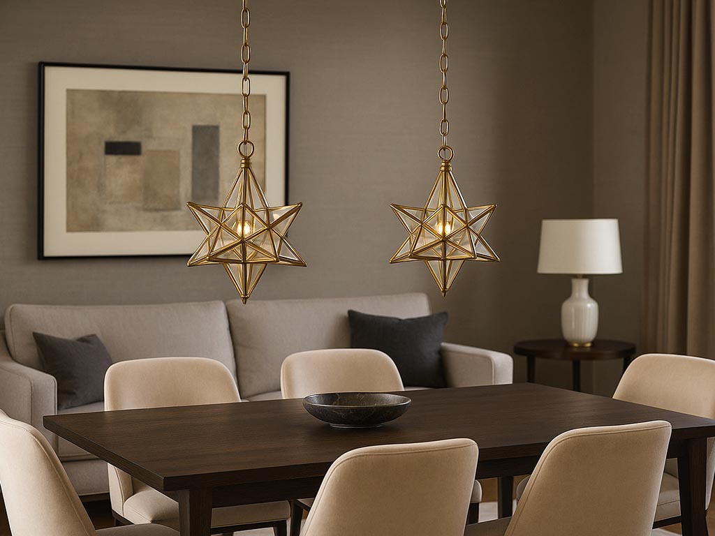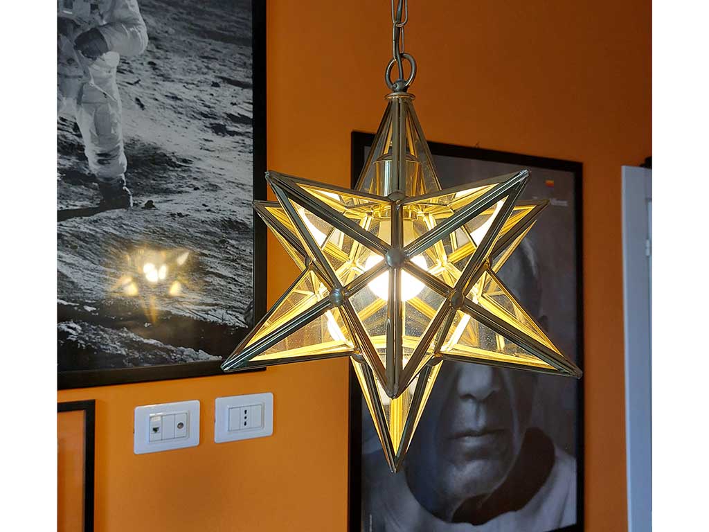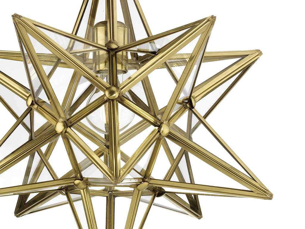 Stella is a stunning designer pendant lamp featuring an elegant and distinctive three-dimensional star shape. Crafted from clear glass panels and a refined brass frame, this striking light fixture perfectly balances classic charm with modern design. Inspired by Renaissance art and also known as the Urbino Star Pendant, Stella adds timeless elegance to any setting.