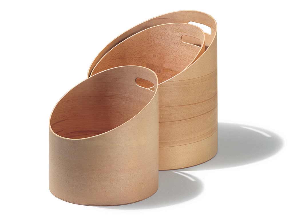 Design storage baskets, wooden baskets, suitable as container for firewood, wooden boxes, toys storage basket or wooden magazine rack. Storage baskets made of bent beech wood. Elegant design stackable boxes.