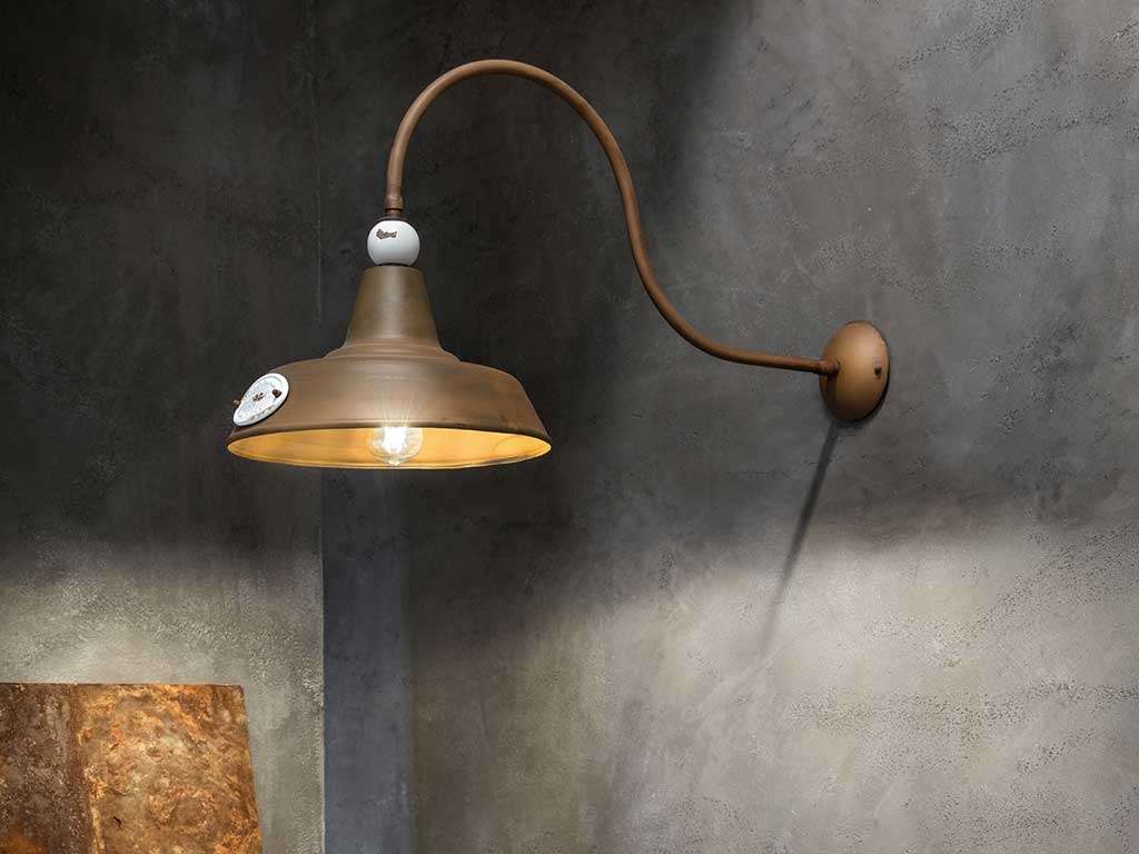 Vintage industrial style wall lamp, made of metal, ceramic and antiqued iron Corten. The vintage and antiquated style is obtained through wear’s effects, which are realized on purpose using handcrafted techniques and paying attention to every single detail. Color of the ceramic elements: Black or white. DIMENSIONS: Ø 35, H 45, Thickness 85 cm 1 x MAX 77W E27 Kg 2,00 Bulb not included Particularly suitable and recommended for style houses or for public places, restaurants and hotels wanting to create a unique atmosphere.