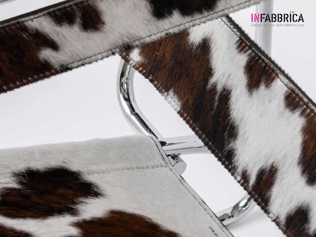 Chrome-plated steel frame. Seat, back and armrests in leather or Pony with welded ends.