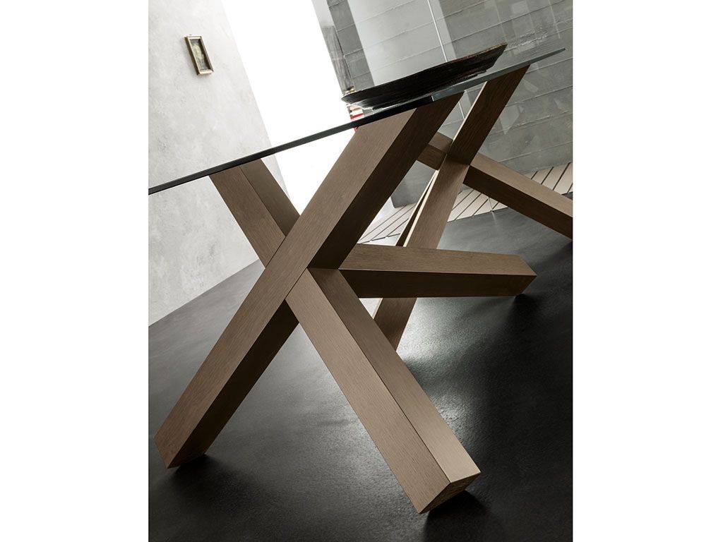 Set table of modern design, with two crossed legs base in solid painted, or lacquered oak and transparent glass flat surface. The table is available in many versions, with both one color or bicolor legs.