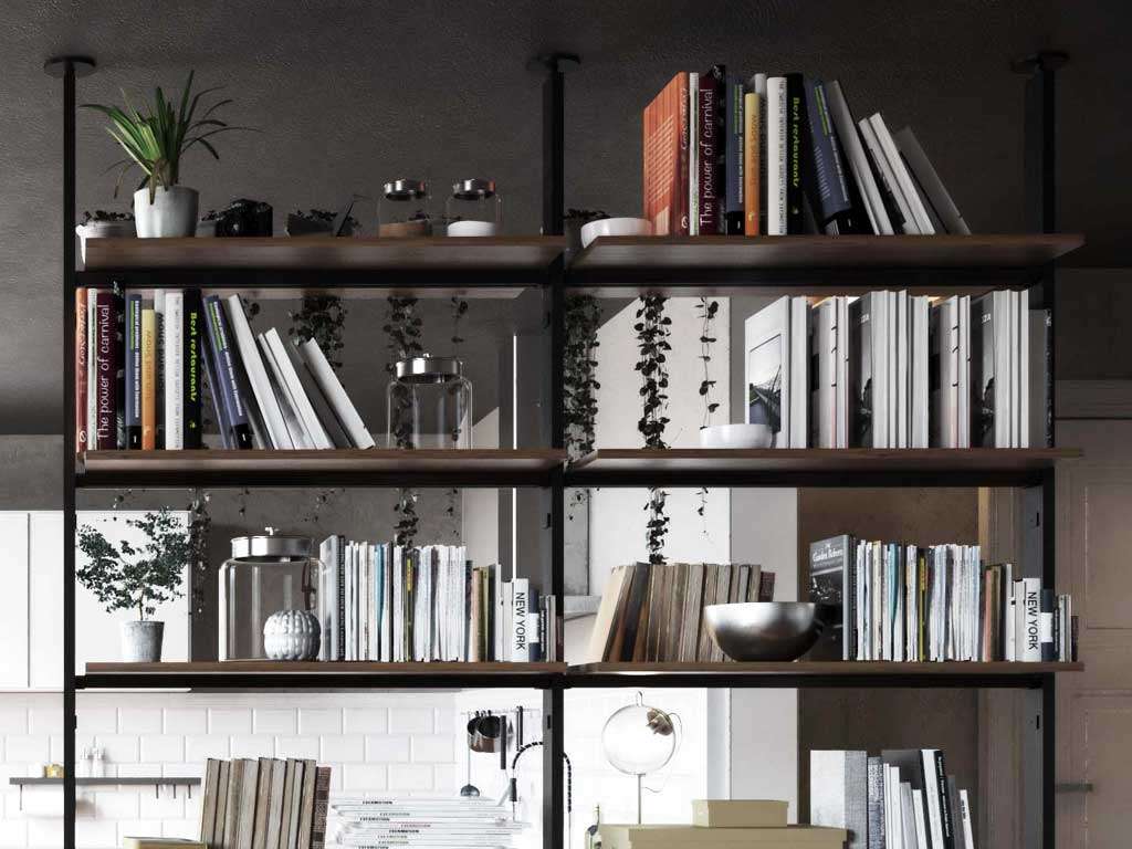 Modern Swedish-style double-sided bookcase with aluminium structure and wooden shelves.