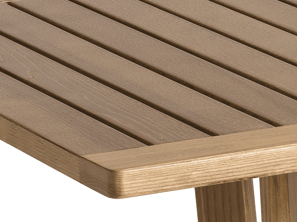 Ash wood table, top with spaced slats and base with levelling feet. Ideal as a garden table or outdoor table.