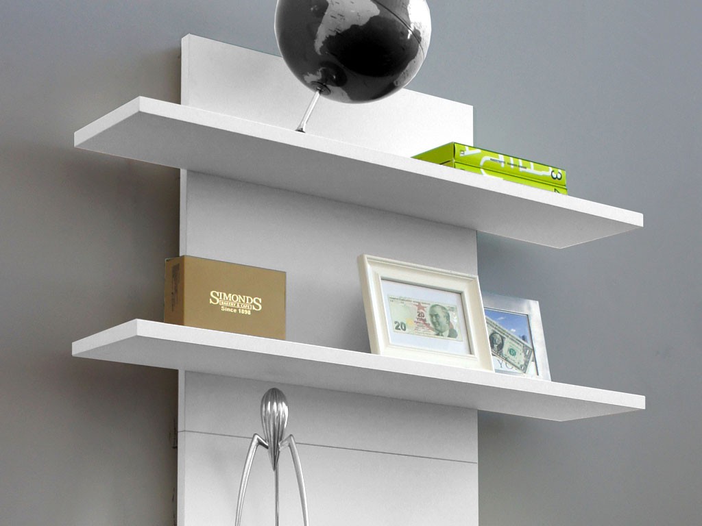 E' una libreria tecnologica in lamina bianca composta da un pannello a parete retroilluminato e due capienti mensole.